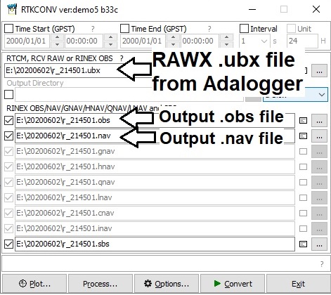Here we enter our .ubx file from our rover’s logger and create the .obs and .nav files. Again, review RTKLIBExplorer’s multiple posts regarding this tool for full instructions.