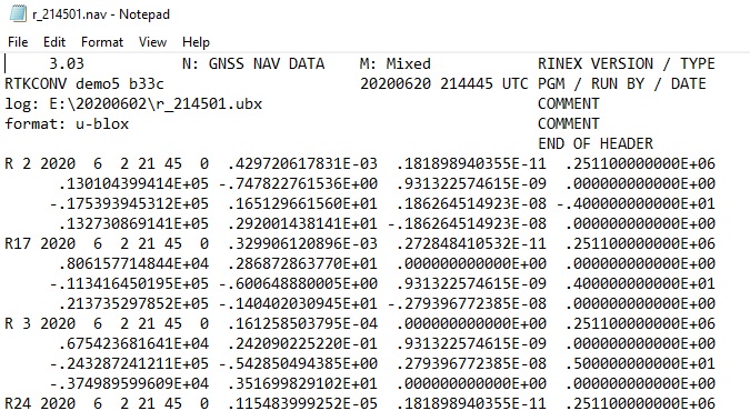 Once we have Convert’ed this file we can then view our output .nav and .obs files to confirm the data appears to be reasonable.